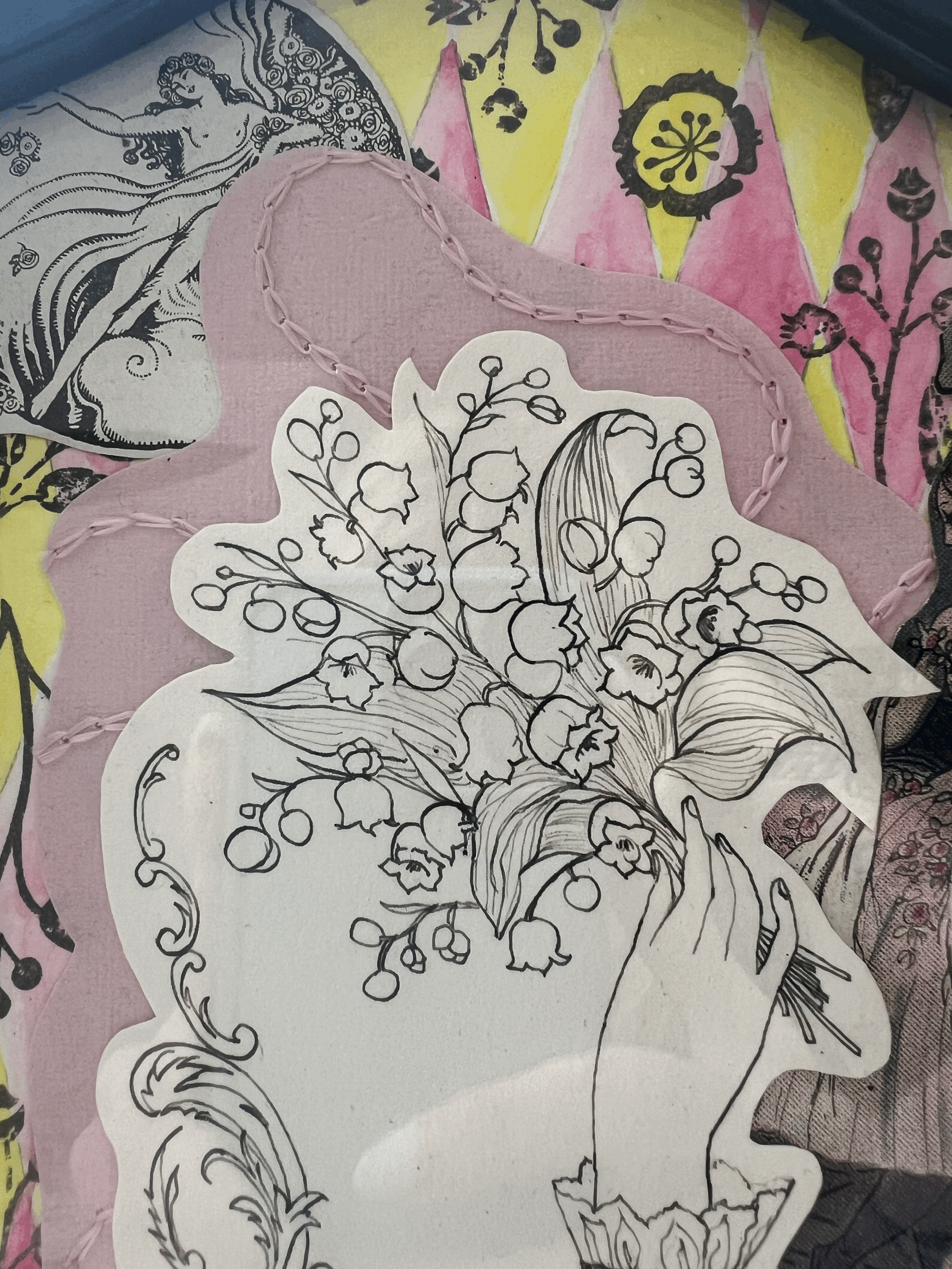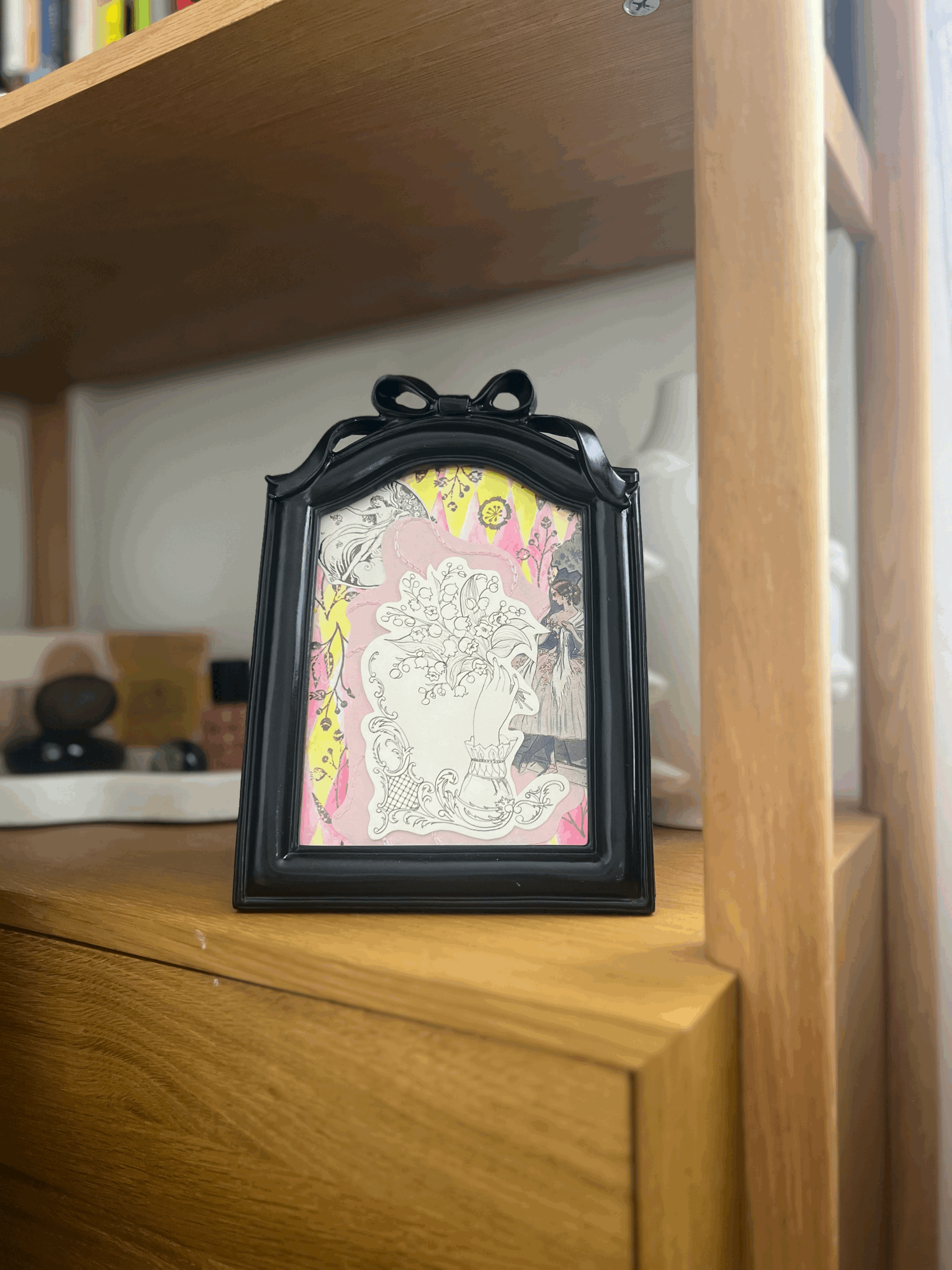 Parlez-vous français? Made of vintage theater programs, valentines, and stamps— alongside my own watercolors— this unique collages’ materials came home in my suitcase from a summer of research abroad. 5×7 framed for tabletop display, but easily convertible for wall hanging.